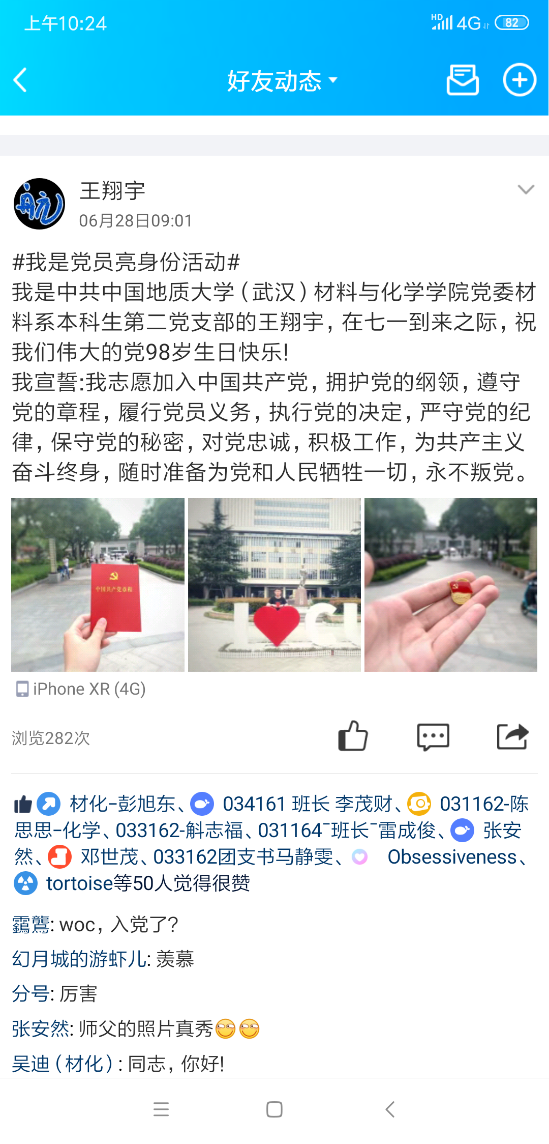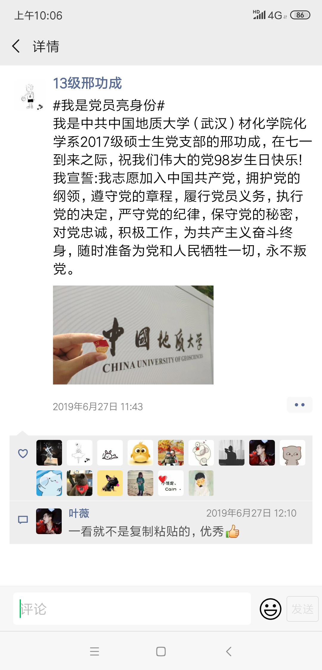 原来,这是材化学院党委在“七一”到来之际组织开展的“我是党员亮身份”的线上活动。来自11个学生党支部的近百位党员参与其中,为党的生日送上最好的礼物。党章、党徽、党员手册都成了大家晒图的标配,有的学生党员以校门口、化石林、图书馆这些具有学校特色的景观为背景,有的学生党员还露脸出镜,脸上写满了作为一名共产党员的骄傲自豪。党员们“亮身份”的举动引来了广大同学的关注,同学们纷纷在下面留言,表达“党员同志优秀”的赞美,表达“无比羡慕”的心情。