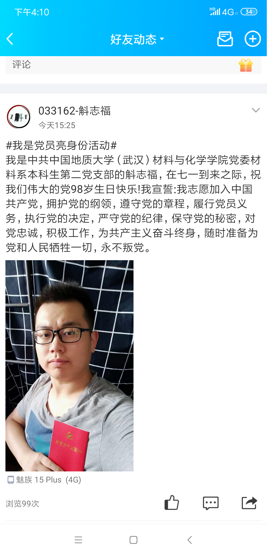 材料系本科生第二党支部斛志福前不久刚刚从一名预备党员转为了正式党员,他在这次活动中将党章放在胸口自拍了一张照片,“我的亮身份的照片想要传达的意思是:党在我心中。参与这个活动提醒我,要时时刻刻记得自己的党员身份,积极承担党员责任,切实履行党员义务,并接受老师和同学们的监督。”