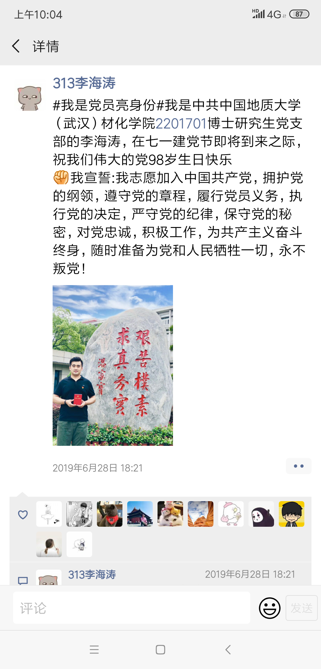 (通讯员:张健茹 林士君 吴迪)“我是williamhill中文(武汉)材化学院材料系18级硕士生党支部的田硕,在七一到来之际,祝我们伟大的党98岁生日快乐!我宣誓:我志愿加入中国共产党,拥护党的纲领,遵守党的章程,履行党员义务,执行党的决定,严守党的纪律,保守党的秘密,对党忠诚,积极工作,为共产主义奋斗终身,随时准备为党和人民牺牲一切,永不叛党。”研究生党员田硕同志在个人QQ空间里发布了一条这样的说说,立马引发很多同学关注,同学们纷纷给说说点赞。当天晚上材化学院的学生党员们开始陆续发布这样信息,信息逐渐扩散开来,一时间微信朋友圈和QQ空间里被“我是党员亮身份”活动刷屏了。