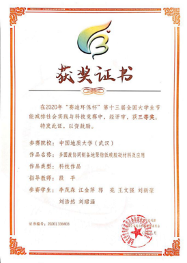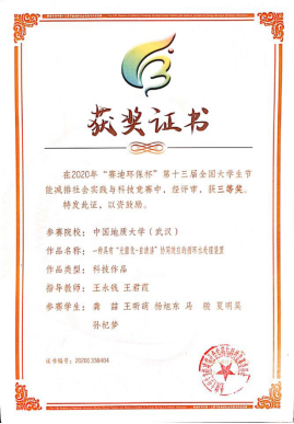 8月31日,2020年“赛迪环保杯”第十三届全国大学生节能减排社会实践与科技竞赛在重庆大学顺利闭幕,我院段平老师指导的李茂森学生团队的“多固废协同制备地聚物低碳胶凝材料及应用”作品,王永钱、王君霞老师指导的龚喆学生团队的“一种具有“光催化-自清洁”协同效应的循环水处理装置“作品,均荣获三等奖。