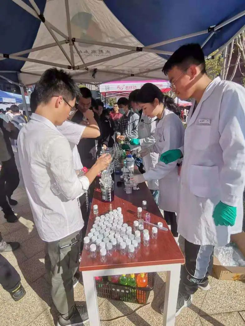 “大家仔细看,现在溶液是黄色的,震荡烧瓶,变红色;继续震荡,变绿色;静置10秒,变红色;再静置20秒,又变回红色”。“化学红绿灯”团队讲解员一边操作一边讲解,如同变魔术一般,一摇一晃之间,随意操控着这烧瓶世界里的色彩更替,宛如马路上的“红绿灯一般”。