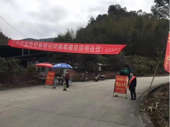 图一 村子的路口挂起了防控疫情的横幅