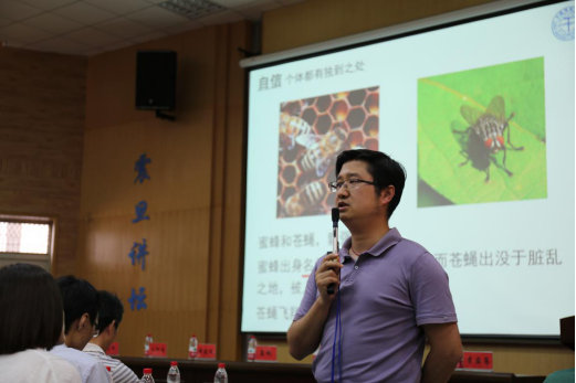 院长夏帆以“大学,梦想起航的地方”为主题,从学院基本情况、学院毕业生就业和考研情况及通向成功的两个重要素质三方面与在座的18级新生进行了深入交流。首先他从学科建设、人才培养、党团建设等方面介绍了学院的基本情况,然后他又以自信和勤奋为切入点,强调了自信和勤奋是通向成功的两个重要素质,并以蜜蜂和苍蝇为例,与全体新生互动,引导新生不断思考,找到自己的优势。在谈到勤奋时,夏院长以罗斯福成长奋斗的故事、一万小时定律为例勉励新生们勤奋学习,专注科研,勇往直前。最后夏院长以“宝剑锋从磨砺出,梅花香自苦寒来”一诗与新生共勉。