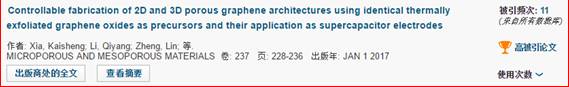 基本科学指标数据库(ESI)最新统计数据显示,我院夏开胜副教授(第一作者)、周成冈教授(通讯作者)等2017年在国际分子筛协会官方期刊《Microporous and Mesoporous Materials》上发表的学术论文“Controllable fabrication of 2D and 3D porous graphene architectures using identical thermally exfoliated graphene oxides as precursors and their application as supercapacitor electrodes”于2018年1月入选ESI全球高被引论文(前1%),williamhill中文(武汉)WilliamHill威廉希尔为唯一通讯单位。