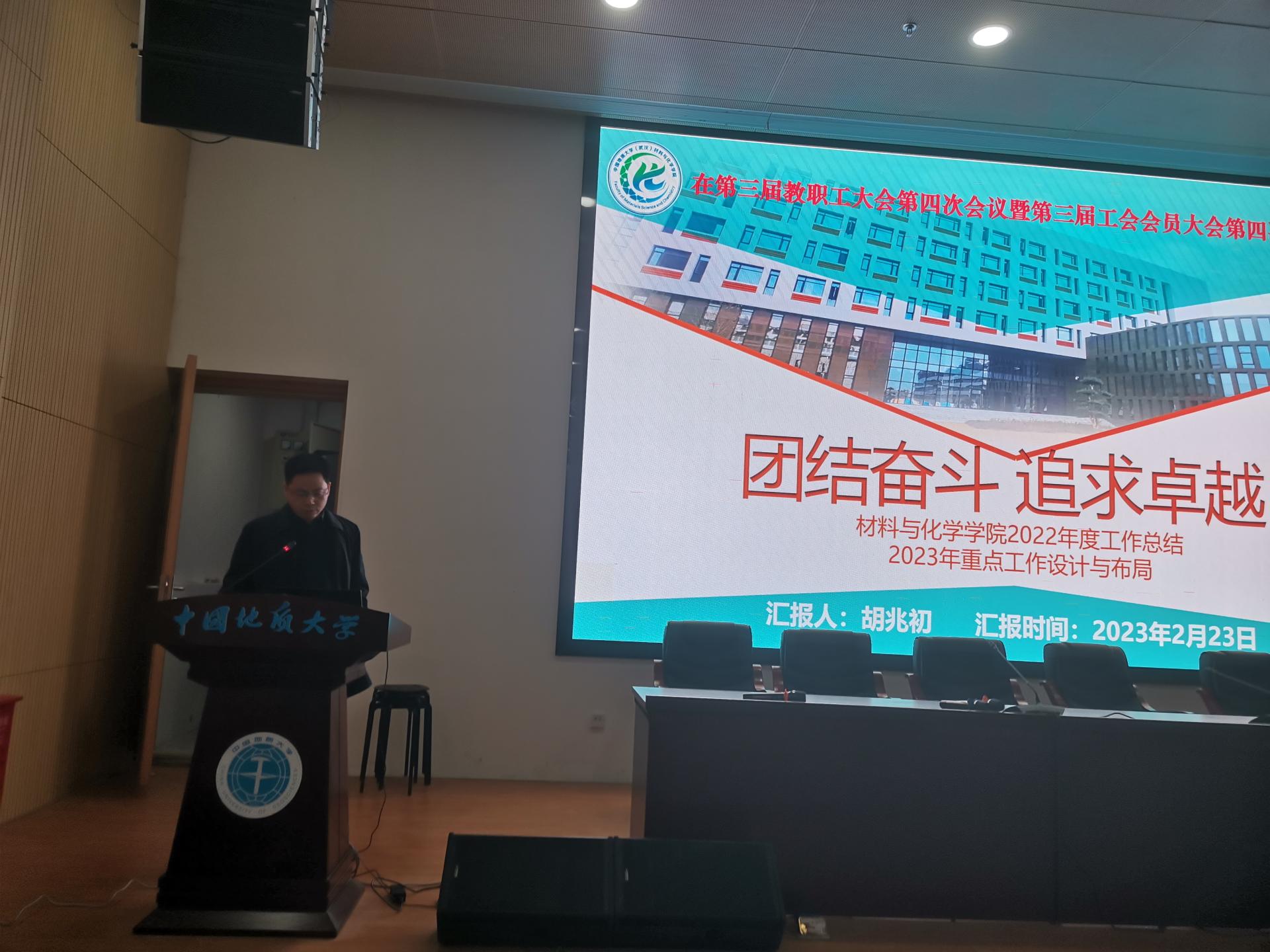 2023年2月23日下午,材化学院第三届教职工大会第四次会议暨第三届工会会员大会第四次会议在未来城校区科教五110会议室隆重召开。大会在雄壮有力的国歌声中开始。材化学院副书记余江涛同志主持会议。