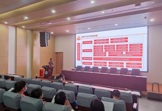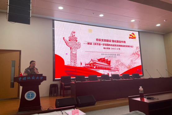 材料与化学学院党委书记黄菊老师以《夯实支部建设 强化堡垒作用》为题详细解读了学校党委《关于进一步加强和改进党支部建设的实施方法》。黄菊按照实施办法的具体要求分7个部分具体讲解,进一步明确党支部和支部委员工作职责,明晰支部建设工作制度,严格落实支部委员会建设要求,不断健全学生党支部工作体系。黄菊要求各支部以《williamhill中文(武汉)学生党支部考核评价指标体系》为准则,充分发挥战斗堡垒作用,以持续提升支部建设质量为重点,对标对表切实做到“七个有力”,提高支部战斗力。
