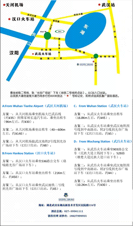 2. 报到地点:武汉市纽宾凯鲁广国际酒店3楼,地址:湖北武汉东湖高新技术开发区民院路124号。交通指南见附件一。